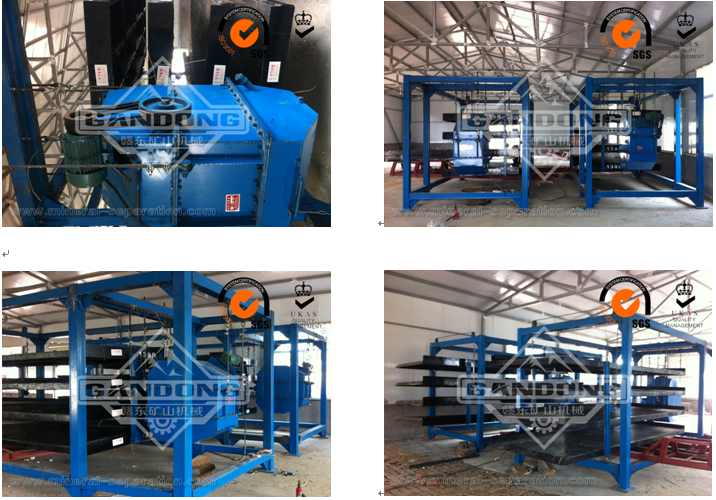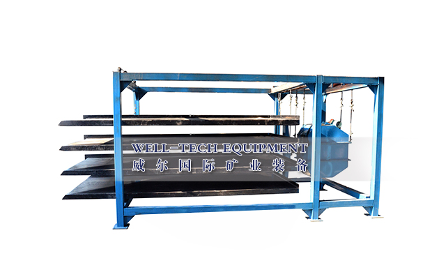 懸掛式搖床床面懸掛而床頭安裝在地面的半懸掛式搖床。采用凸輪杠桿結(jié)構(gòu)的床頭,床面共六層,用鋼絲繩懸掛在機架上。適用于分選74~19μm的微細粒金屬礦石。懸面式六層搖床是由座落式六層搖床演變而來。保留了較適于分選別細泥的凸輪杠桿式床頭,采用了屜架式懸掛床架,重量輕、每層床面可呈抽屜狀進出,床面拆裝方便,它有空間利用率高、動力消耗少的優(yōu)點。