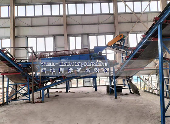 通過鏟車從爐渣庫房處鏟出爐渣,把料裝入料斗,再用輸送帶送入滾筒進行篩分,分出大小料。