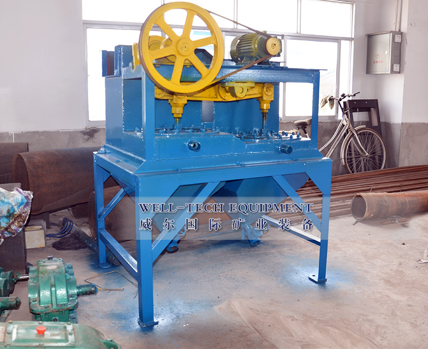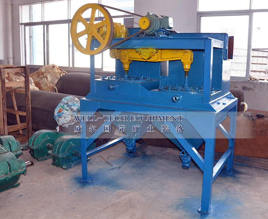 雙斗隔膜跳汰機結構由:機身、傳動裝置、分水器、隔膜和活栓等主要部分組成,機體有兩個大小的跳機斗,每個隔膜斗用不到底的隔板將其分成跳汰區(qū)和隔膜區(qū)兩部分。跳汰過程是靠橡膠隔膜作上下往復運動所造成介質(水)的鼓動來進行。電動機通過三角皮帶帶動大皮輪轉動,使偏心軸上的連桿上下運動,與此連桿連接的搖臂也上下運動,搖臂上另有二連桿連接橡膠隔膜、從而使隔膜獲得上下往復運動,進行跳汰。