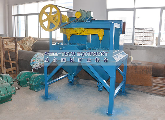 由于工作篩的上面加了一個篩子,故隔膜跳汰機可用于處理粒度不均勻的物料。(注:此篩根據(jù)訂貨要求可不供給)入選原礦被送入跳汰室后,由于隔膜的鼓動作用,礦粒在介質中被按比重分層;細而重的礦粒通過人工床顆粒的間隙和篩孔,沉集在跳汰斗的儲礦中、上層粗而輕的礦粒(礦物)被介質流沖向篩子末端的排礦口,由于后跳汰室比前跳汰室的位置低50mm,故輕礦粒經(jīng)過前室尾板溢出而進入后室,再次受到跳汰。根據(jù)需要可調(diào)節(jié)尾板位置的高低,以控制排礦量的大小。 儲放斗中的精礦定期由排礦管排出。