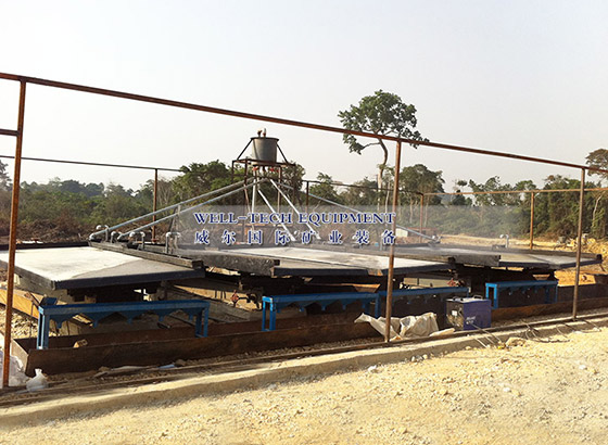 搖床的選礦過(guò)程是在具有復(fù)條的傾斜床面上進(jìn)行的,礦粒群從床面上角的給礦槽送入,同時(shí)由給水槽供給橫向沖洗水,于是礦粒在重力,橫向流水沖力,床面作往復(fù)不對(duì)稱運(yùn)動(dòng)所產(chǎn)生的慣性和摩擦力的作用下,按比重和粒度分層,并沿床面作縱向運(yùn)動(dòng)和沿傾斜床面作橫向運(yùn)動(dòng)。因此,比重和粒度不同的礦粒沿著各自的運(yùn)動(dòng)方向逐漸由A邊向B邊呈扇形流下,分別從精礦端和尾礦側(cè)的不同區(qū)排出,最后被分成精礦,中礦和尾礦。