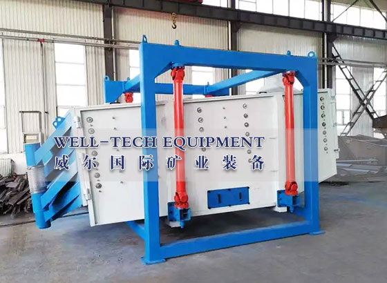 方形搖擺篩的工作原理為:搖擺篩啟動后,設備搖動體即篩箱在慣性力的作用下作前后往復運動,篩箱和篩面連體作周期性搖動,從而使篩面上的物料隨篩箱一同作定向跳躍式運動。期間,小于篩孔的物料通過篩孔落到下層,成為篩下物,大于篩孔孔徑的物料經連續(xù)翻滾跳躍運動后從排料口排出,從而完成篩分工作。