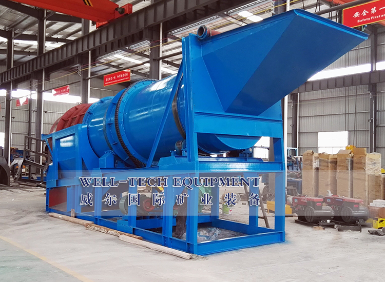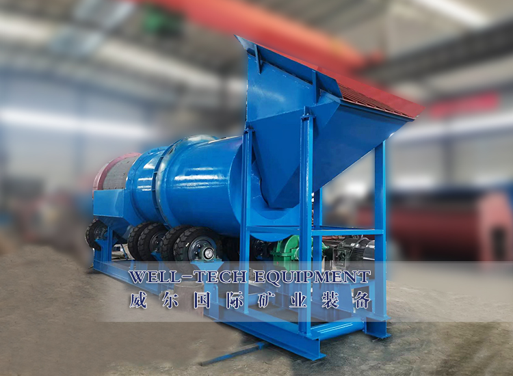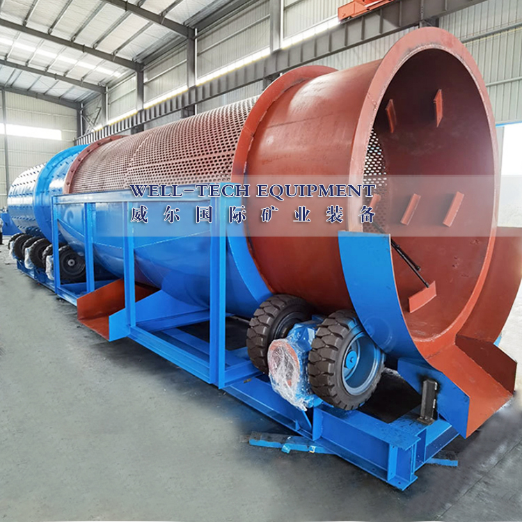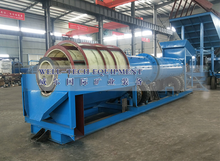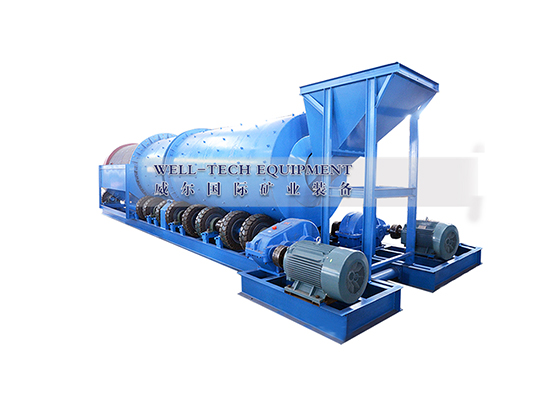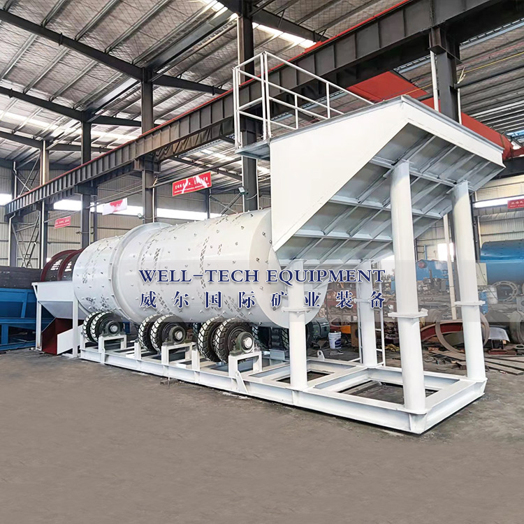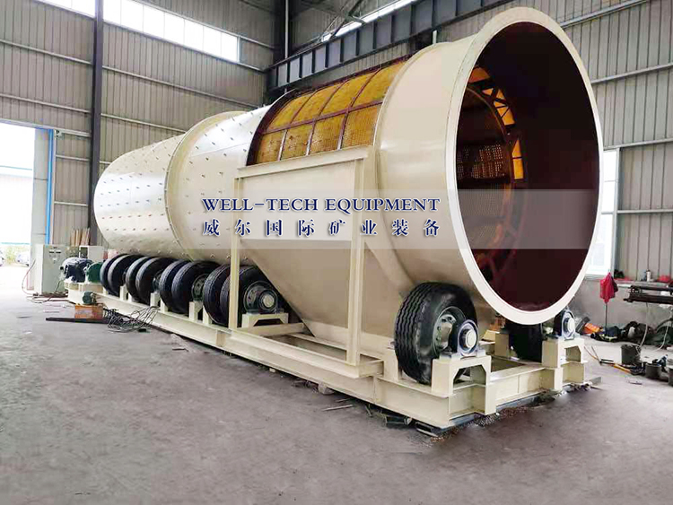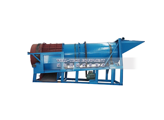 圓筒洗礦機(jī)利用旋轉(zhuǎn)的圓筒和內(nèi)部的刮板以及物料中自有的卵石和巖石來(lái)分解粘土,塊狀物和軟氧化物。洗礦機(jī)的圓筒慢慢地旋轉(zhuǎn),類(lèi)似于一個(gè)巨大的洗衣機(jī)。粗細(xì)不同的物料還有水同時(shí)在一起翻滾攪動(dòng),有效地把有用礦物從泥性土壤,粘土中釋放出來(lái)。分散均勻后漿狀般的物料被圓筒送到尾端,并從溢流口排到錐形篩進(jìn)行篩分。錐形篩把大于有用礦物的粒度的物料排除,篩下的礦漿即可直接進(jìn)入各種各樣的選礦設(shè)備,如離心選礦機(jī),螺旋溜槽,跳汰機(jī)等。